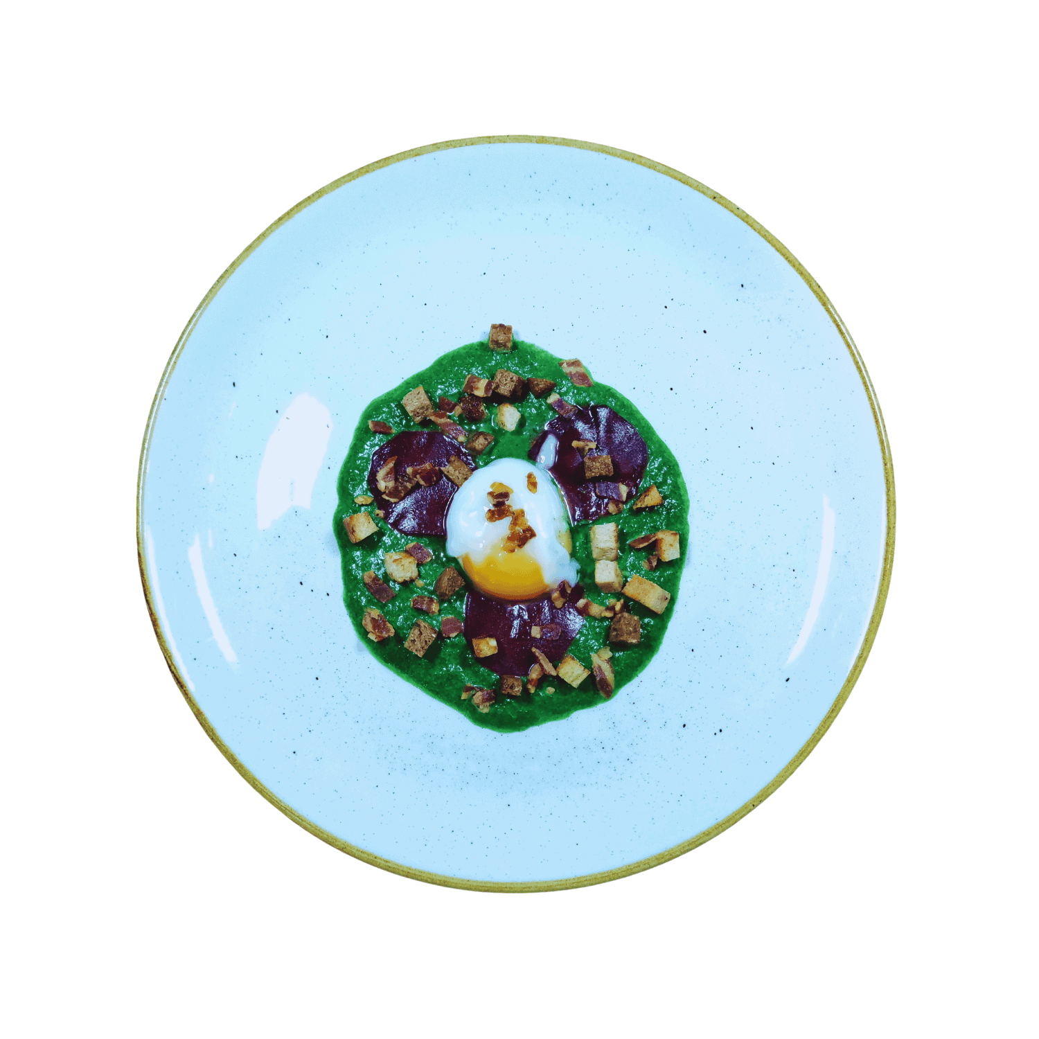 Deconstructed “Knödel” trio with poached egg, spinach cream, speck chips, fermented beets, and bread chips