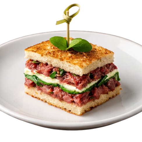 Be the first to review “Mini club sandwich filled with tartare and black shallots, with wild garlic cream”