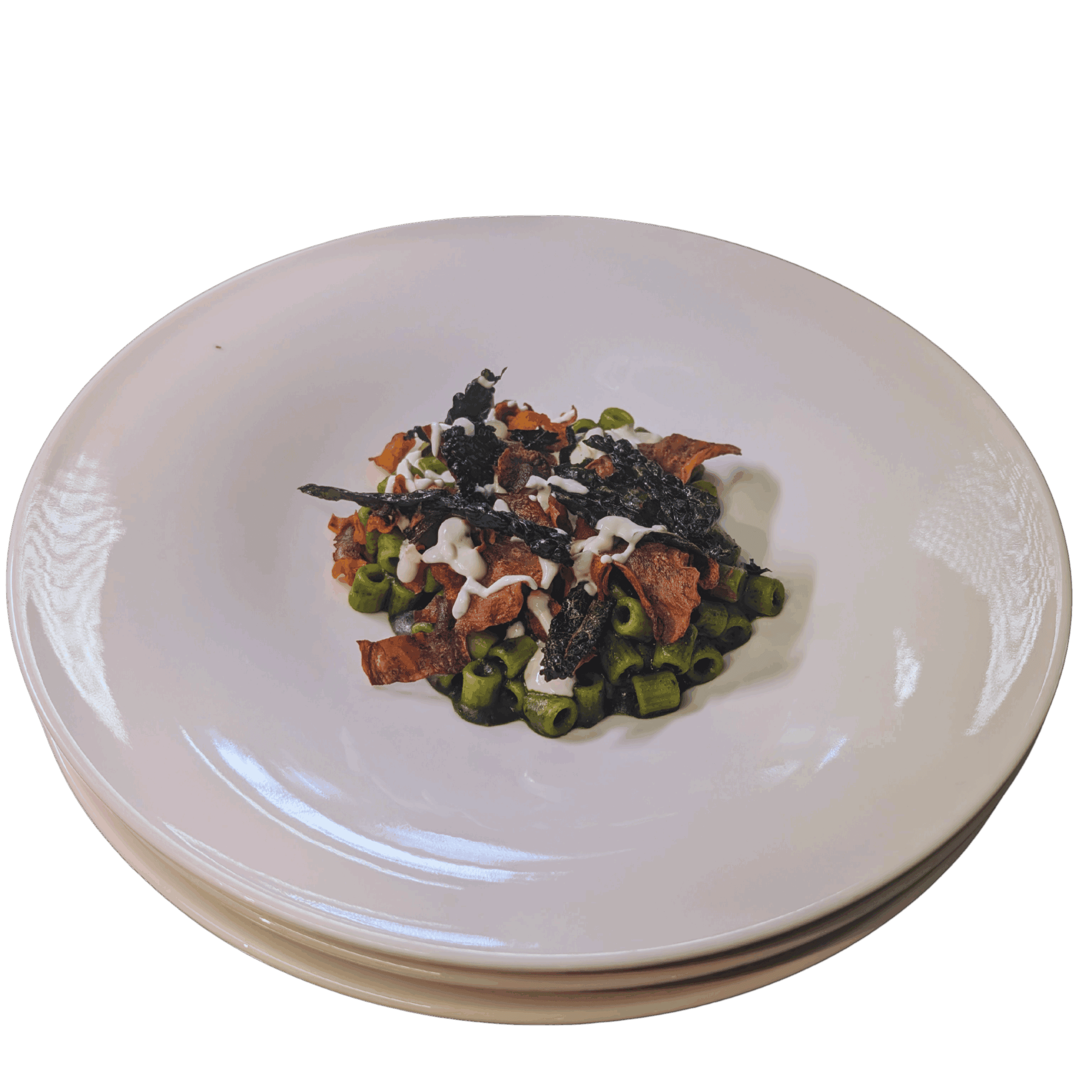 Pasta risottata with black cabbage cream, miso, fermented lemon and vegetable potato chips
