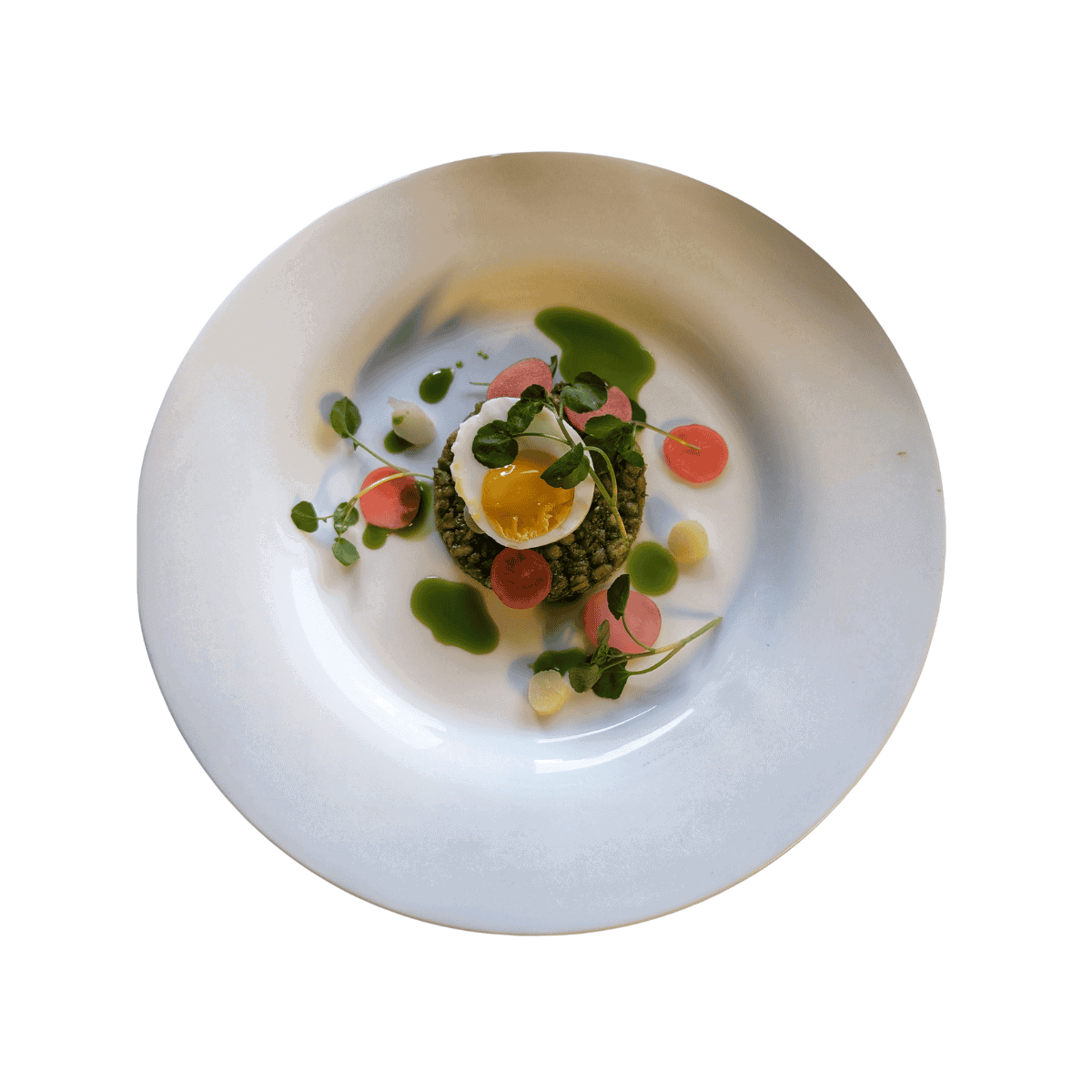 Insalata di asparagi e orzo, aglio orsino, uovo in camicia, ravanelli fermentati e prosciutto contadino
