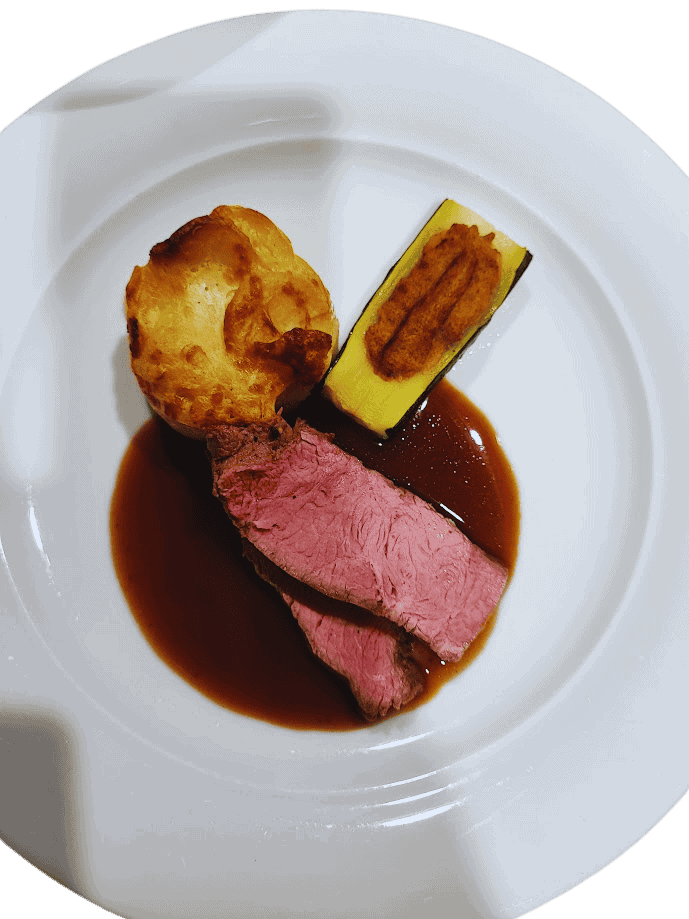 Stinco di vitello con jus al vino bianco, soufflé di polenta e zucchine ripiene
